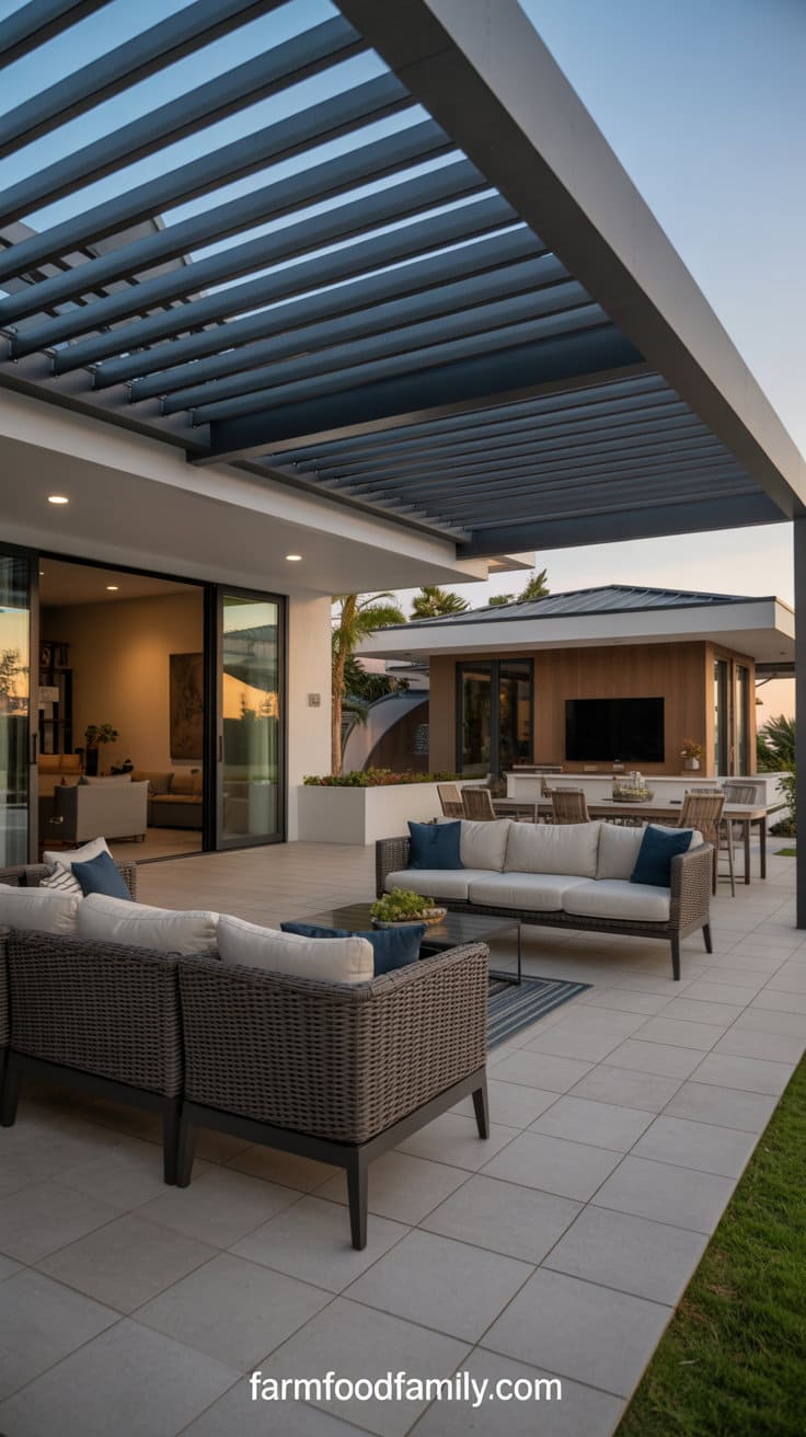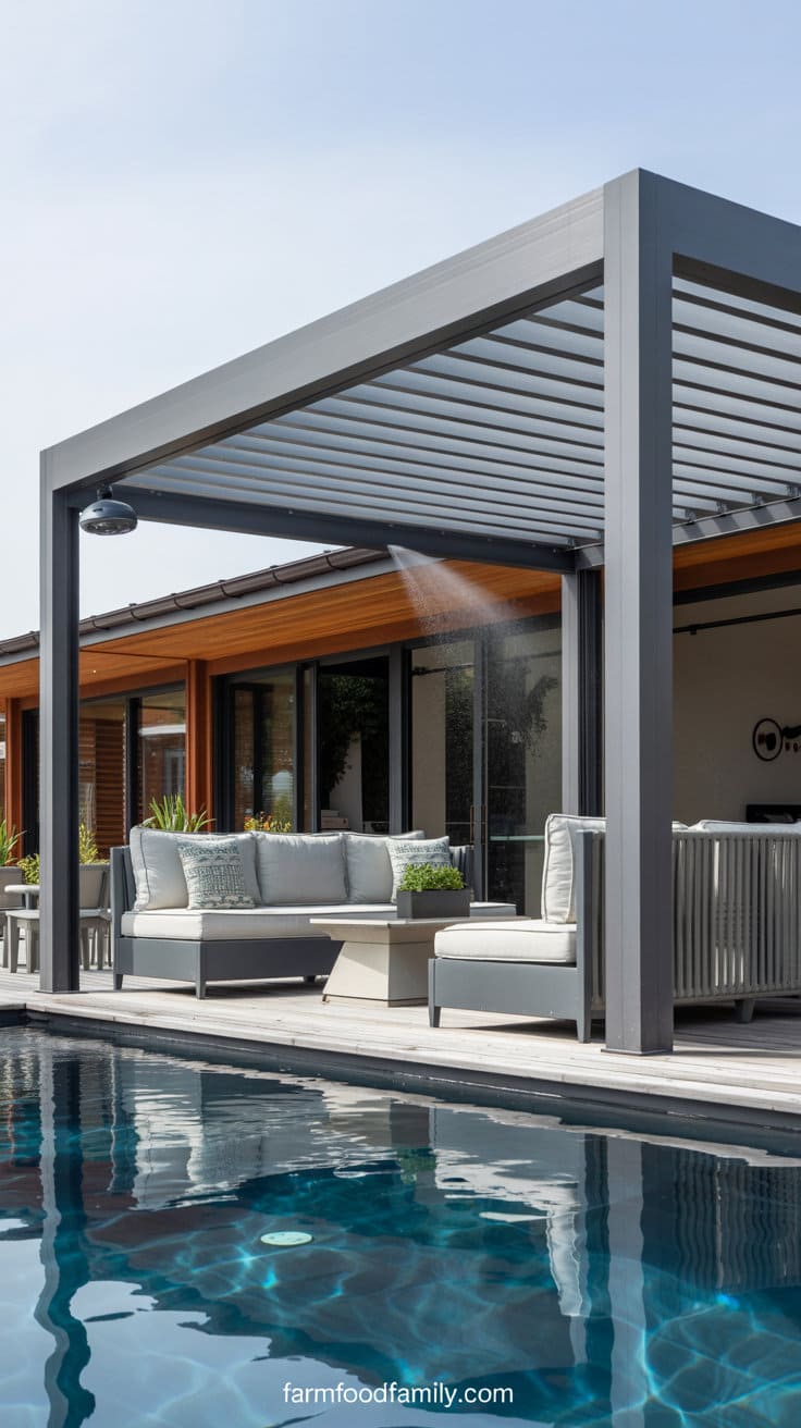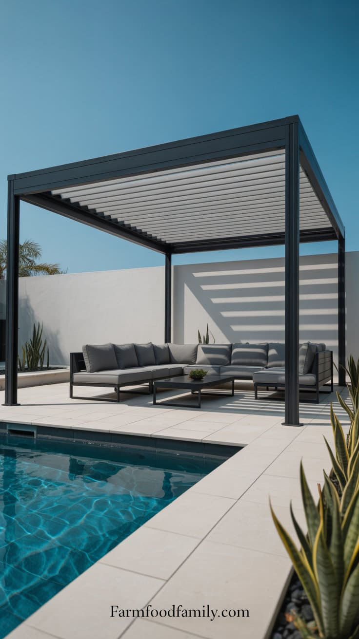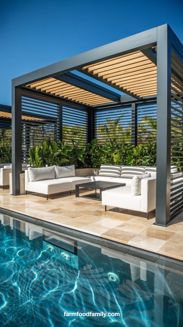 For poolside patios, choose a modern aluminum pergola with adjustable louvers that open and close depending on sun exposure.