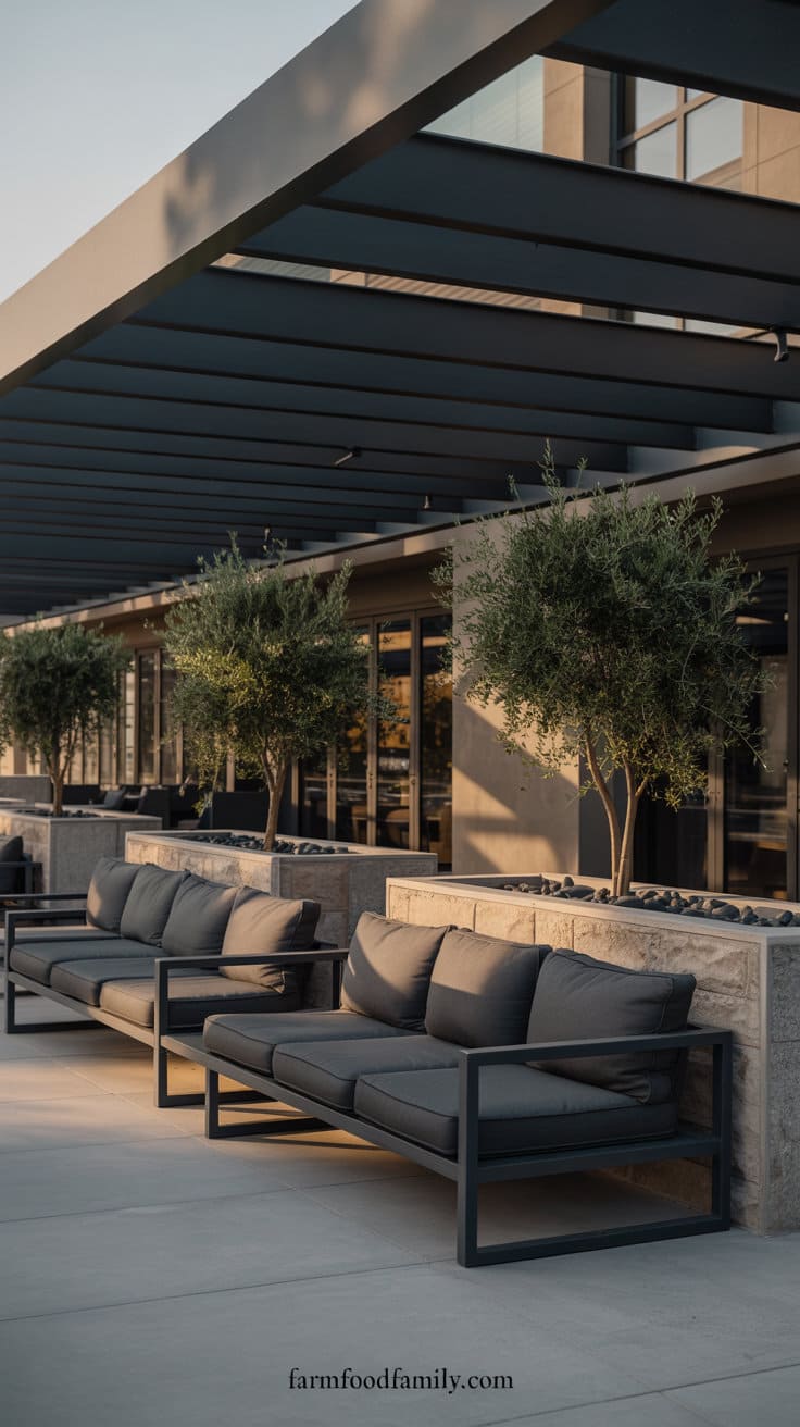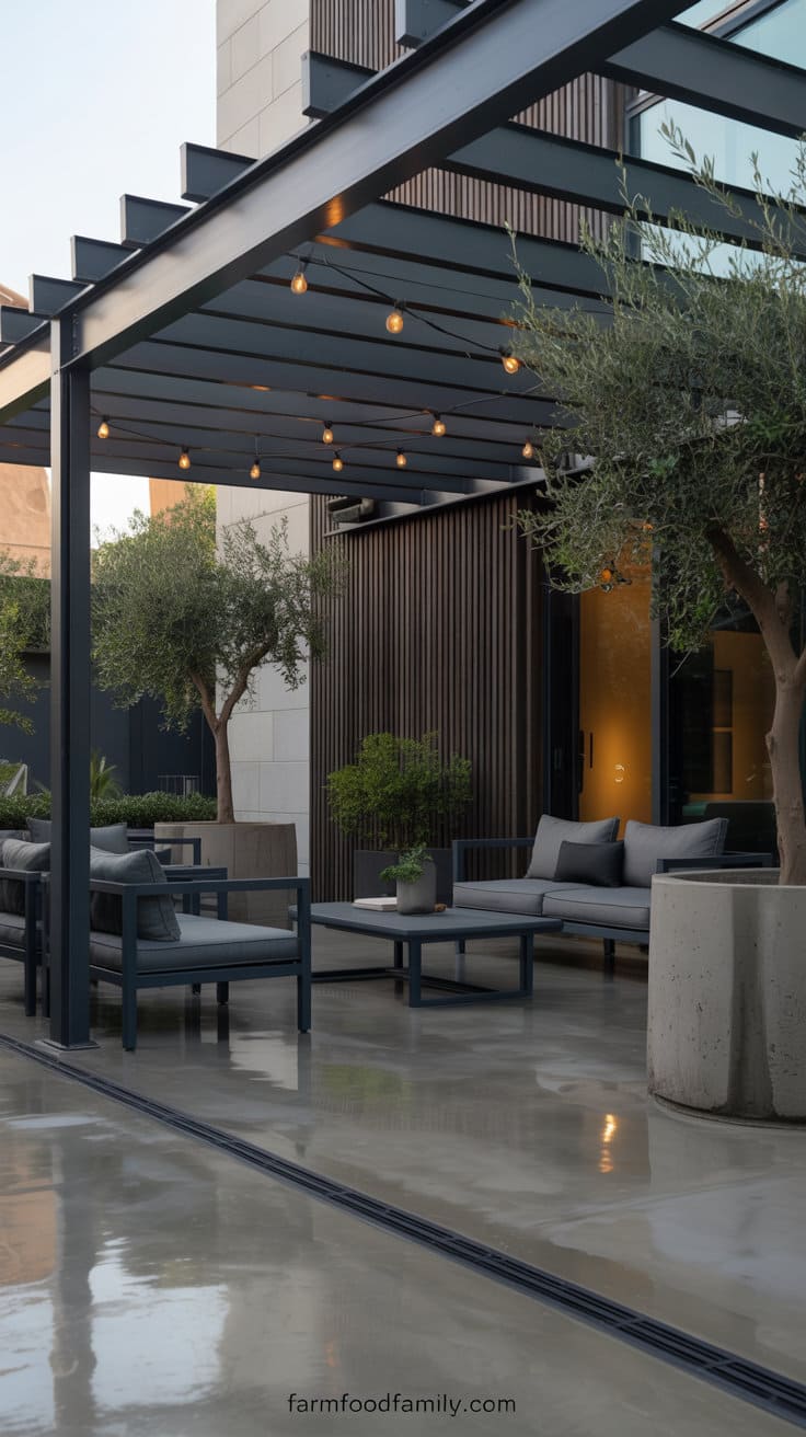 Combine a matte black steel pergola and a polished concrete patio floor to create a modern outdoor lounge with an industrial vibe.