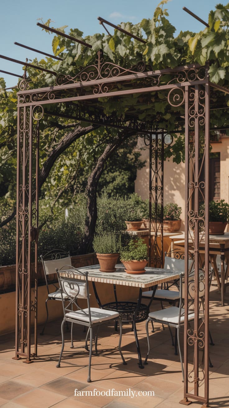 A metal pergola with elaborate scrollwork or bending lines will give you a sun-drenched Mediterranean vibe.