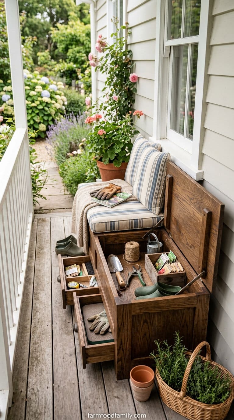 Benches that open up to hide your gardening tools or extra cushions are perfect. These pieces save you a bunch of space and cut down on clutter, making your porch the perfect spot to chill out without feeling boxed in.