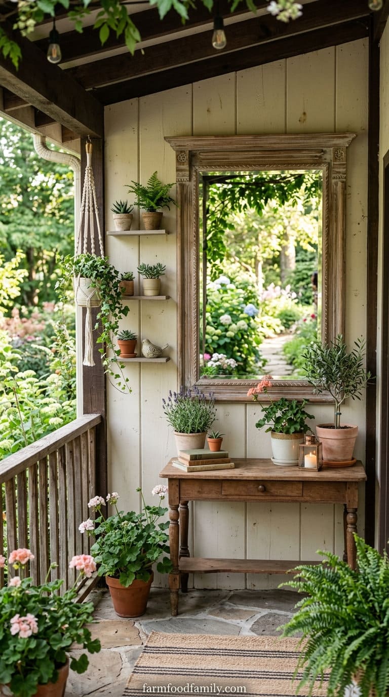Ever think a mirror outside could work wonders? Placing mirrors on your porch can make the space feel twice as big. Position them to catch light or reflect a nice view.