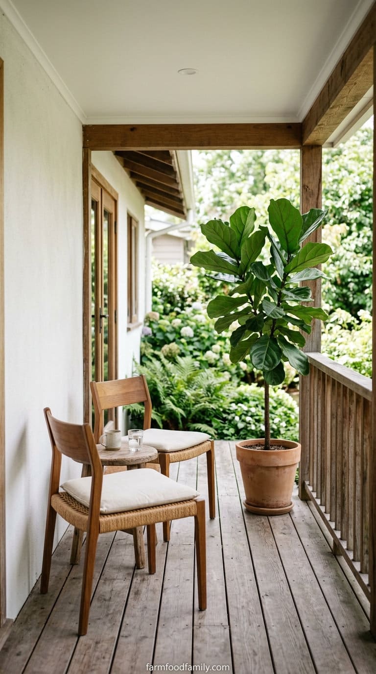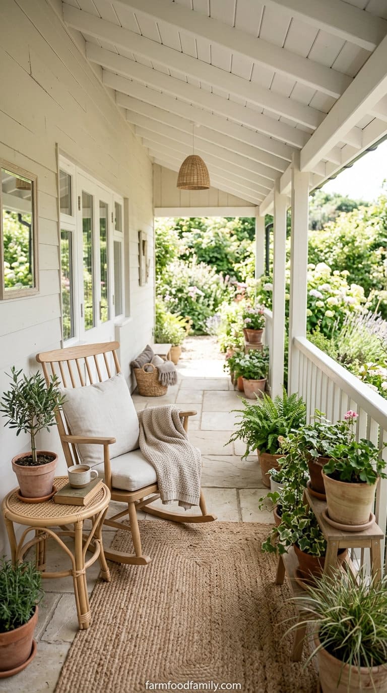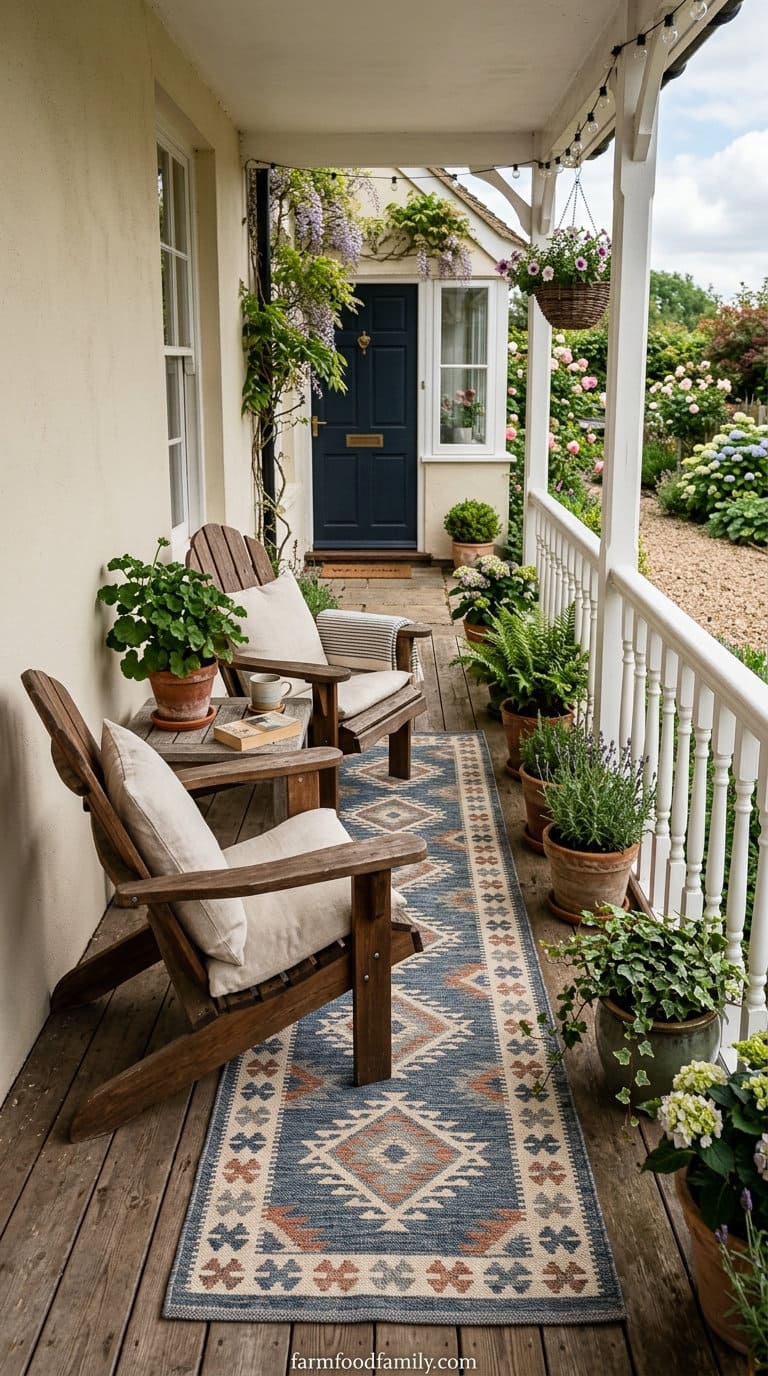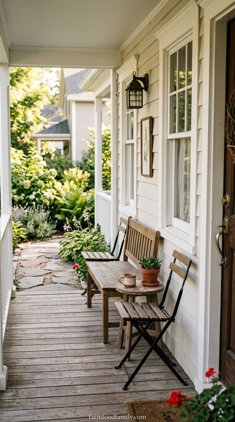 Strip down to the basics: a couple of chairs, a table, maybe a plant or two. This approach not only keeps your porch looking clean and uncluttered but also makes it feel bigger.