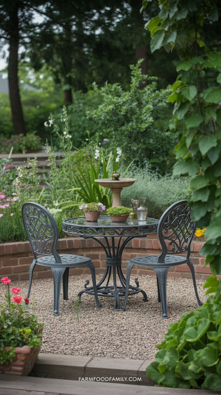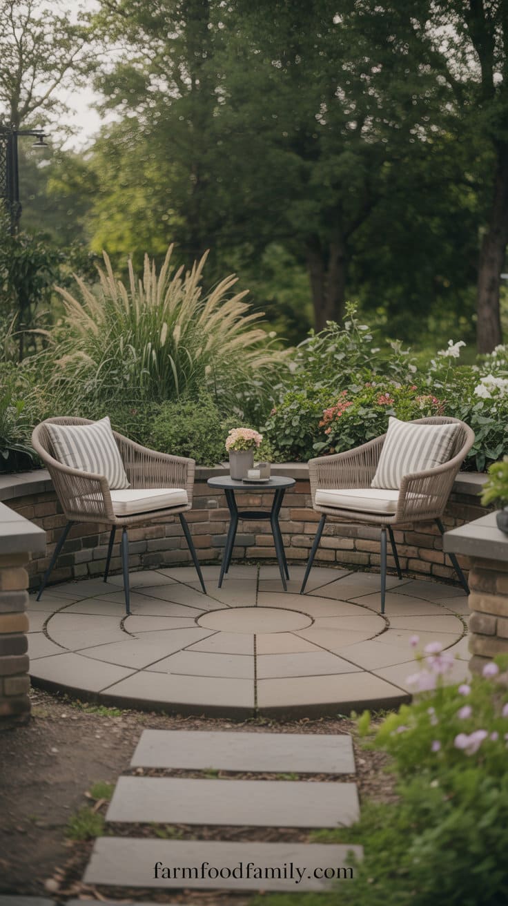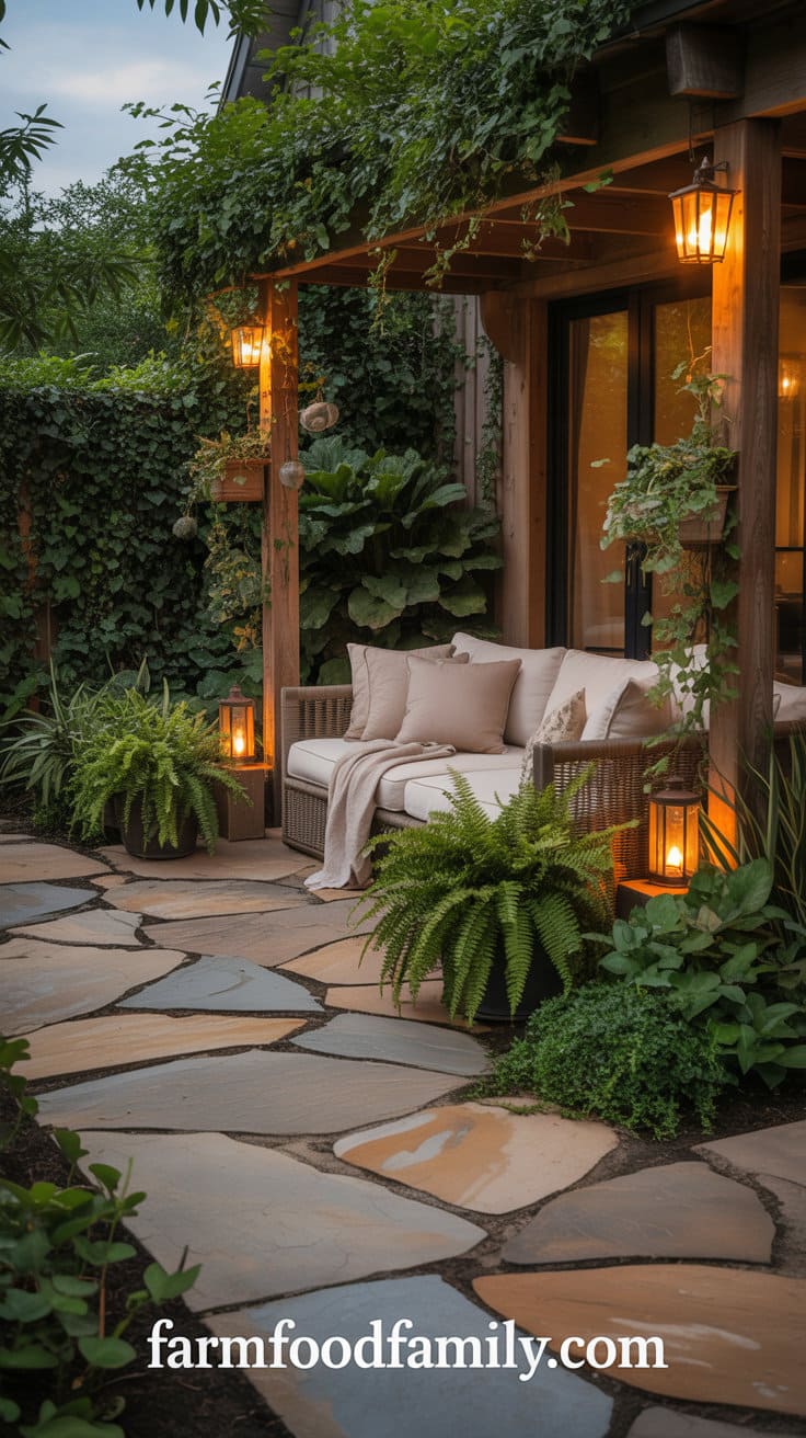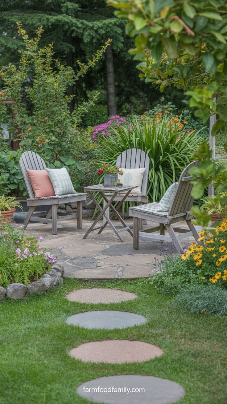 Fill the space with vibrant flowers or beautiful grasses to create an immersive garden atmosphere. Don’t forget solar stake lights or lanterns to softly illuminate the area at night.