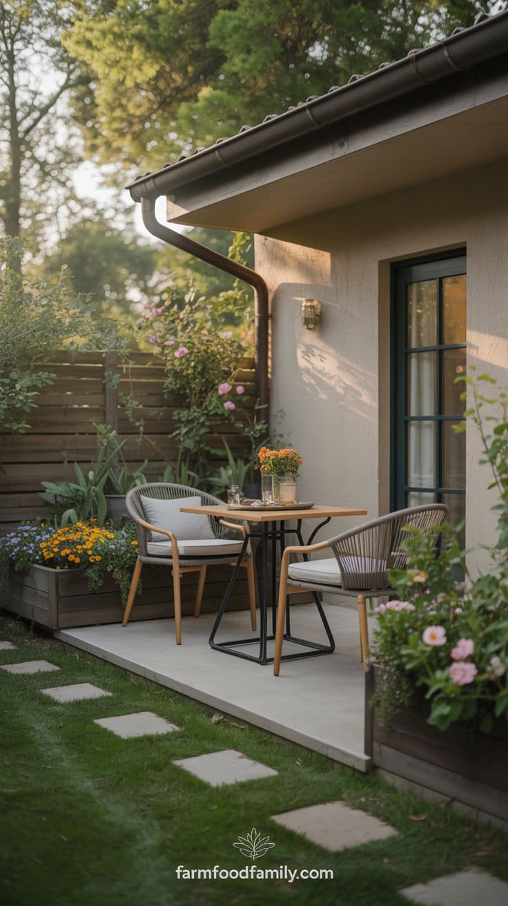 Add a pair of wooden or wrought iron chairs with comfortable cushions, as well as a small table.