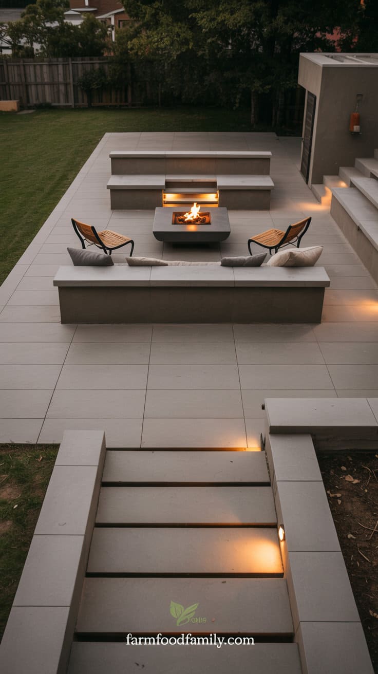 Add ambient lighting with wall-mounted sconces, string lights, or solar step lights. For a high-end look, use natural stone or smooth concrete.