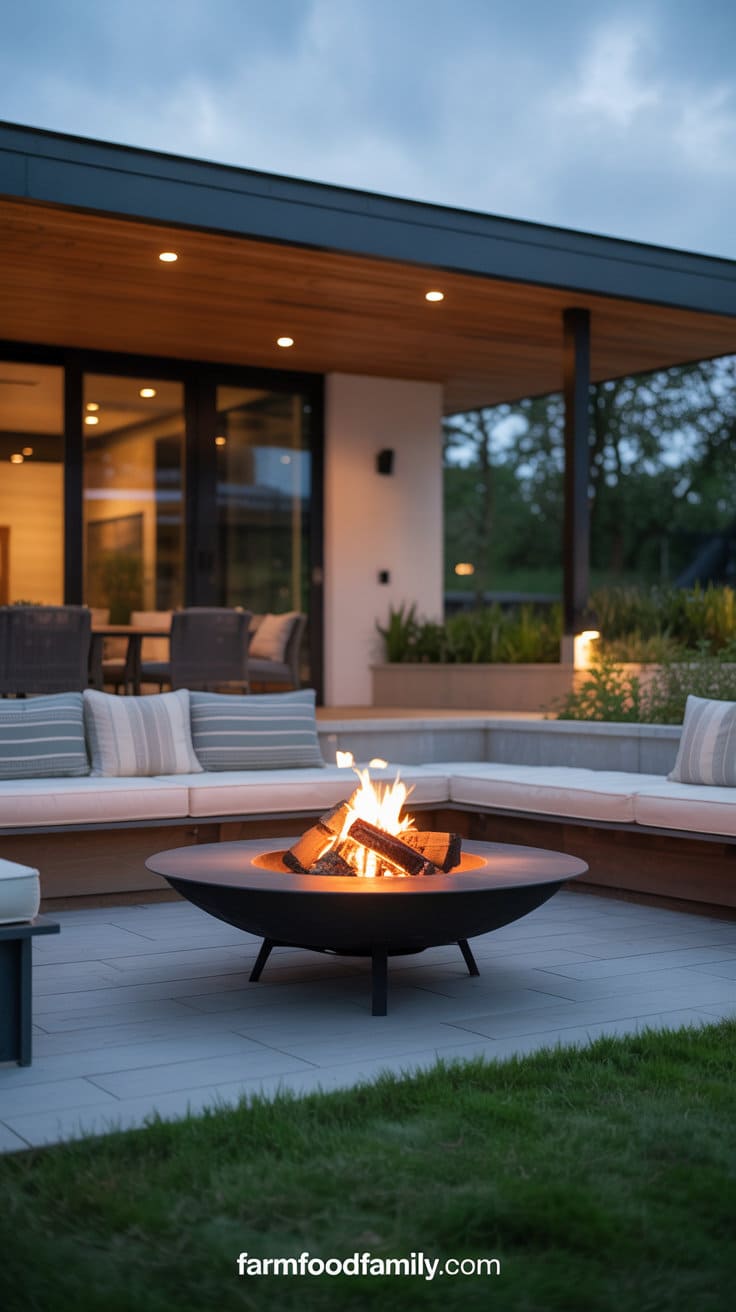 Extend your existing patio with a lower area surrounded by low retaining walls or built-in planters. Set up a spherical fire pit and surround it with built-in seats or outdoor furniture.