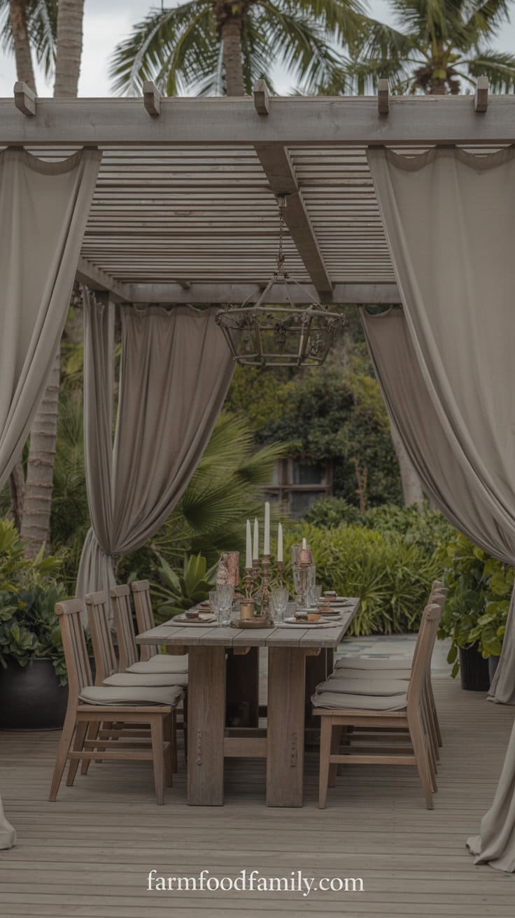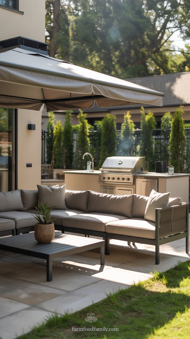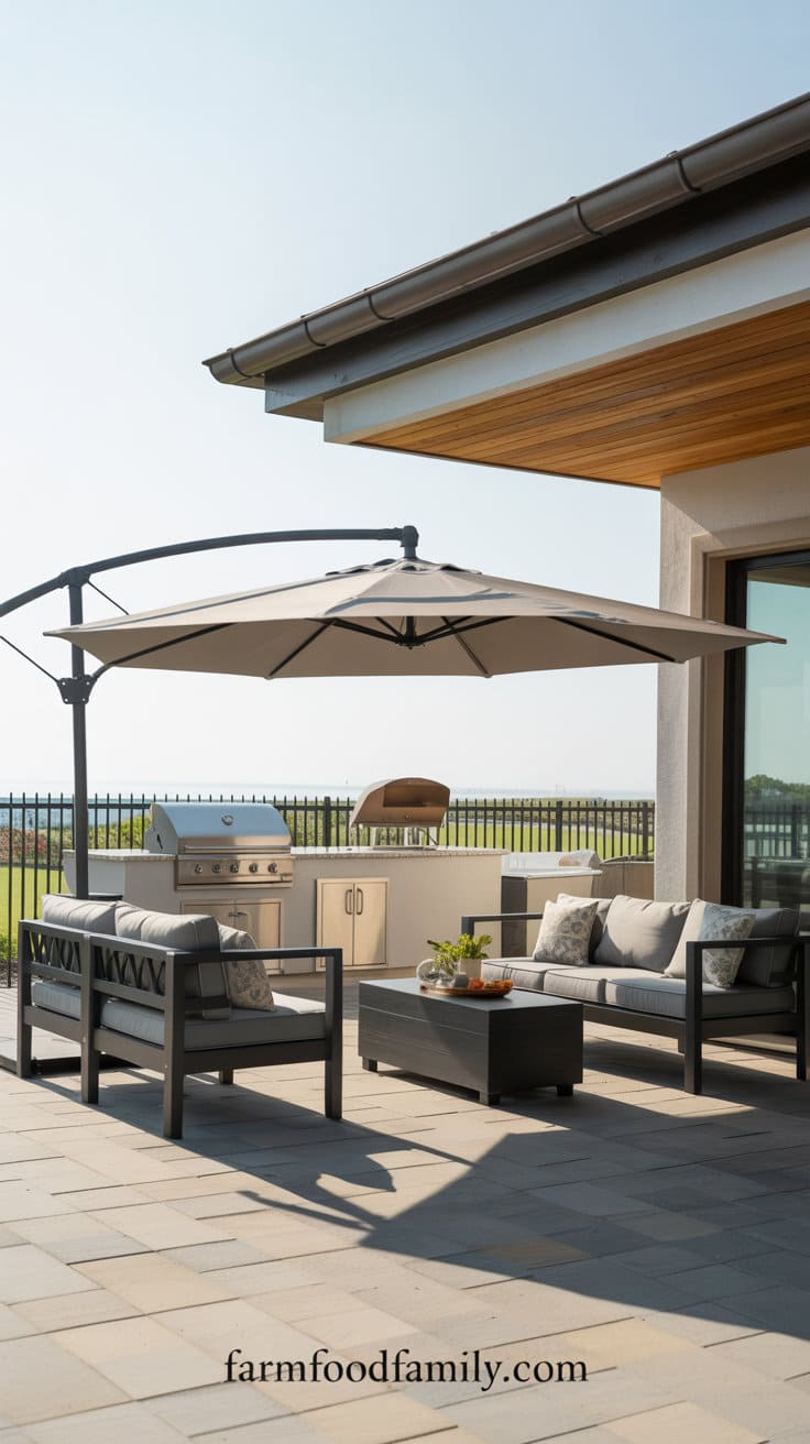 Shade is essential for comfort, so install a pergola, cantilever umbrella, or retractable awning to shield from the sun and light rain.