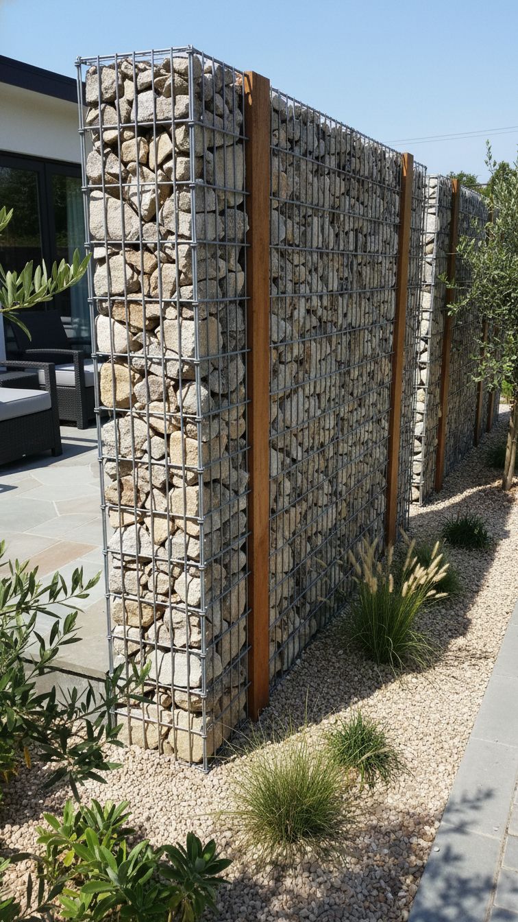 The structure is straightforward but striking, offering both privacy and sound insulation. Keep those wire baskets in good shape, and a gabion fence will hold its ground for years, making it a solid choice for any landscape.