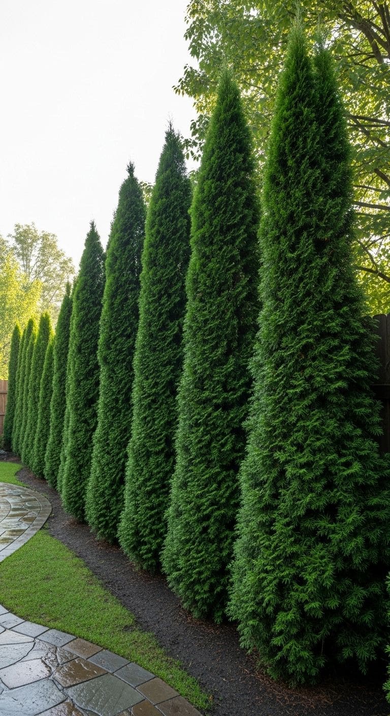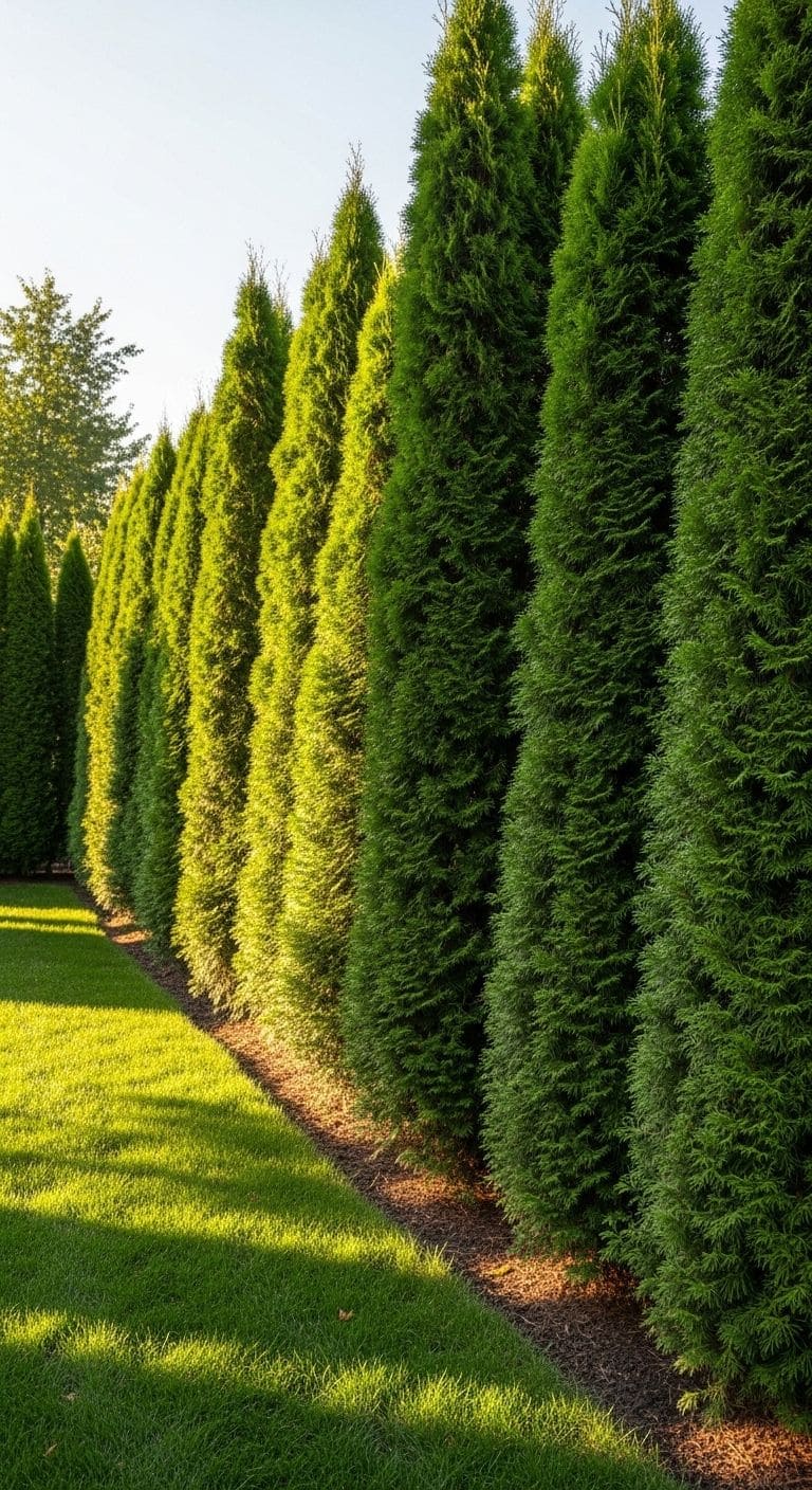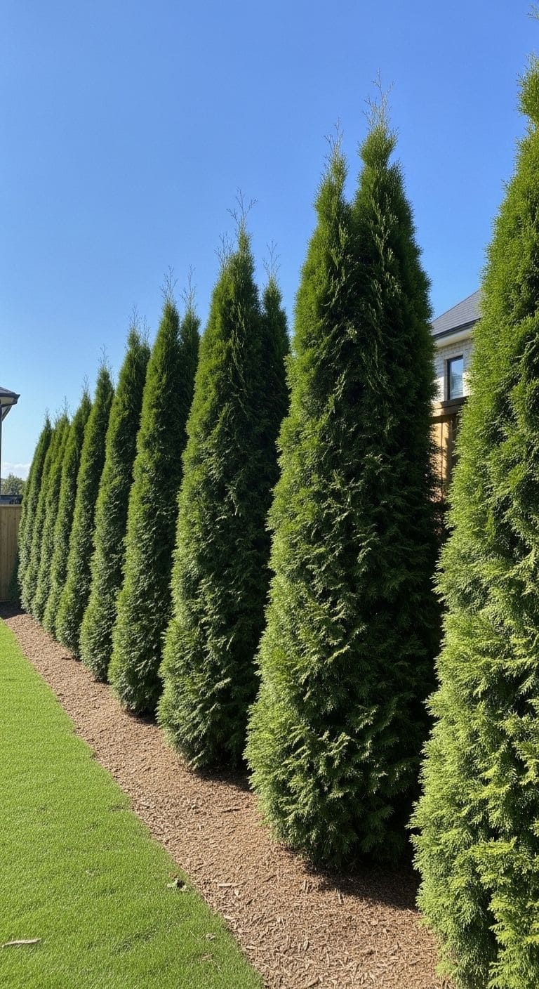 Arborvitae trees are a top pick if you need a solid, living wall. They grow tight and tall, making them perfect for squeezing into small yards. Plus, they’re hardy, which means they aren’t fussy about the cold.