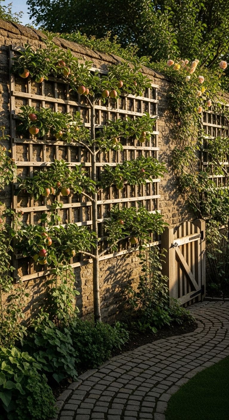 An espaliered tree fence is where art meets gardening. This technique involves training trees to grow flat against a structure, like a wall or trellis.
