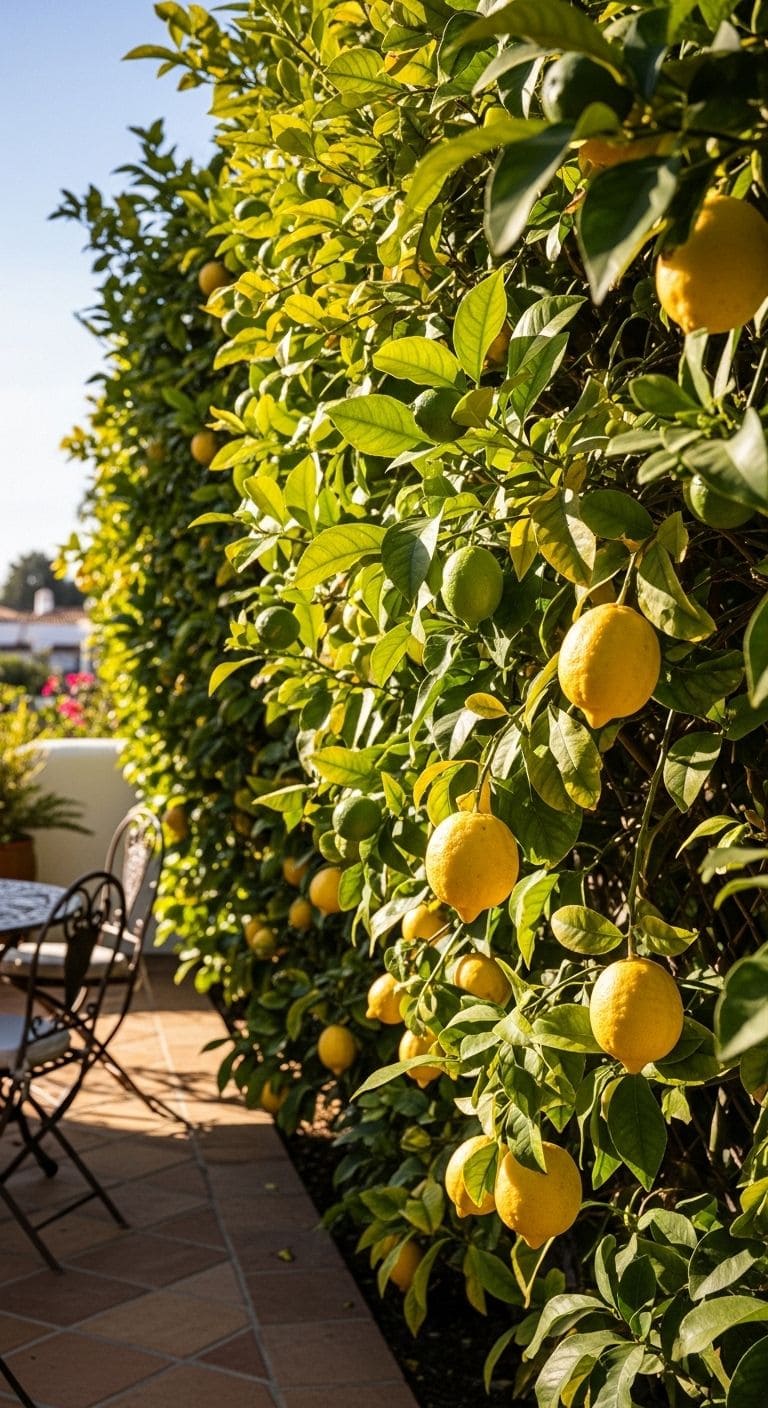 Lemon trees add a zesty twist to any garden fence. These sun-loving citrus plants need plenty of light and a bit of shelter from the wind.