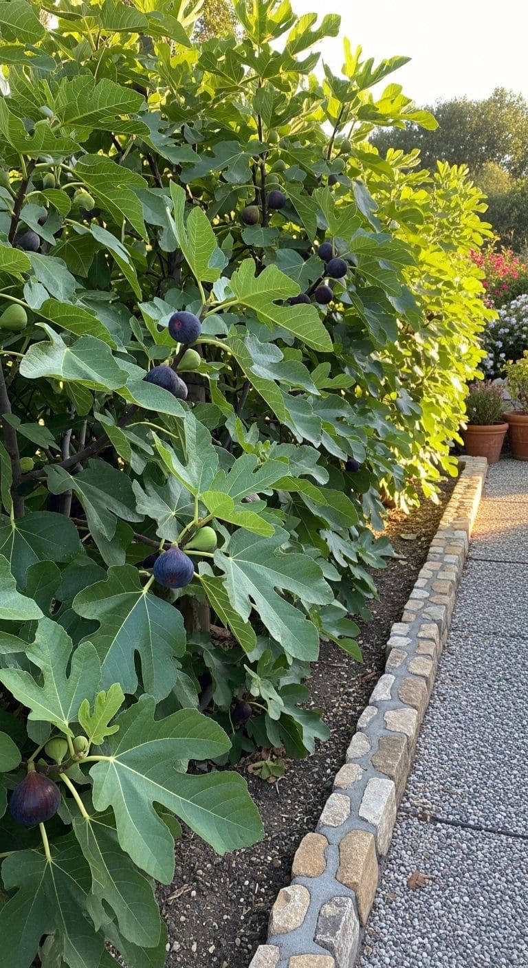 Fig trees are another great choice if you’re after a fence that feeds you. These trees love a spot with plenty of sun and well-draining soil.